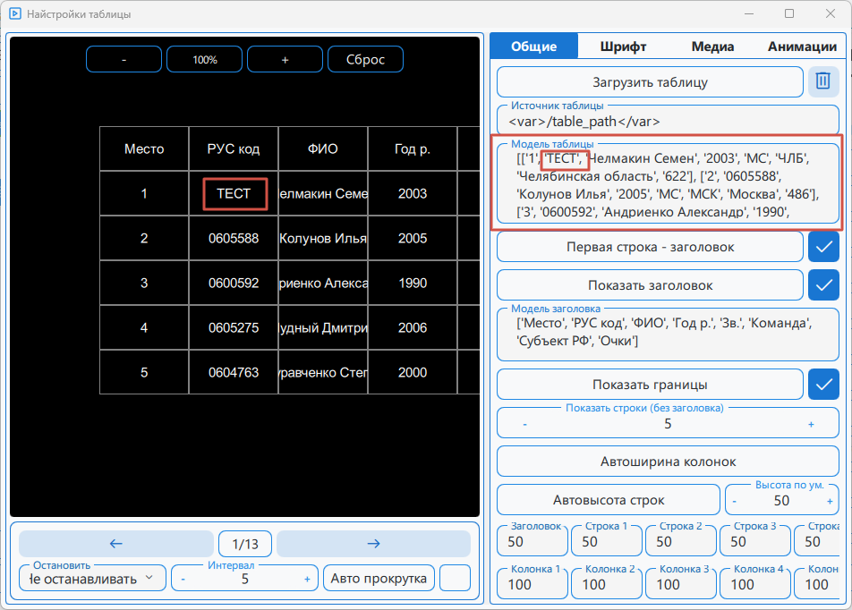 - Режим предпросмотра анимации — при включении анимация автоматически воспроизводится в области предпросмотра при внесении изменений в таблицу.