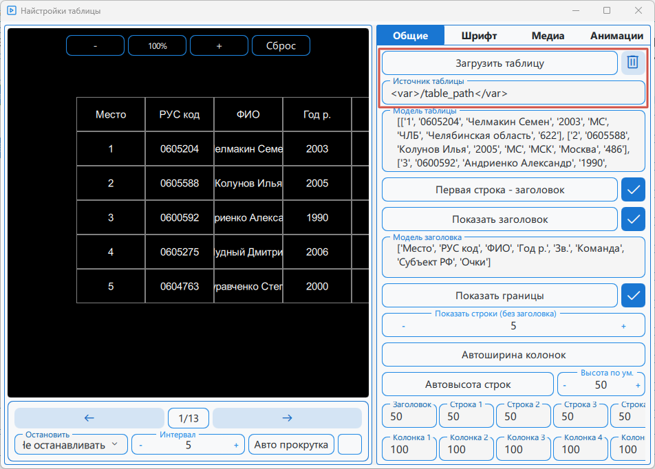 - Показать заголовок — включает или скрывает отображение заголовка в таблице.