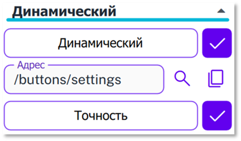 1. Динамический – возможность получать значение для объекта по адресу в datahub (например, для отображения в надписи значения из другого объекта). При выборе этого свойства появляется дополнительное поле для адреса в datahub, а также иконки для поиска адреса среди всех созданных объектов и копирования содержимого адреса