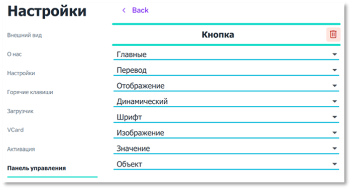 По иконке с карандашом можно перейти к редактированию добавленного объекта. У каждого типа объекта свой набор свойств, о них будет написано далее. Пример для обычной кнопки: