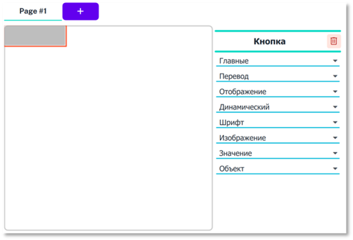 При нажатии на любой из объектов он добавится на страницу по координатам x = 0, y = 0 (левый верхний угол страницы). Большинство объектов при создании имеют стандартный размер 6x2. При создании объект автоматически берётся в фокус, панель редактирования меняется на меню настроек свойств объекта: