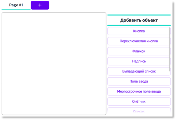 Чтобы добавить объект в основной части программы должна быть открыта панель редактирования (включена через настройки, по иконке с карандашом, предварительно включенной в настройках, или комбинацией клавиш «Ctrl+E»). Если не выделен ни один элемент на странице (при выделении вокруг элемента появляется красная рамка), то панель редактирования представляет собой меню «Добавить объект» со списком кнопок для добавления всех существующих объектов. Список объектов может не помещаться на экране целиком, его можно прокручивать колёсиком мыши или с помощью ползунка справа (появляется при наведении).